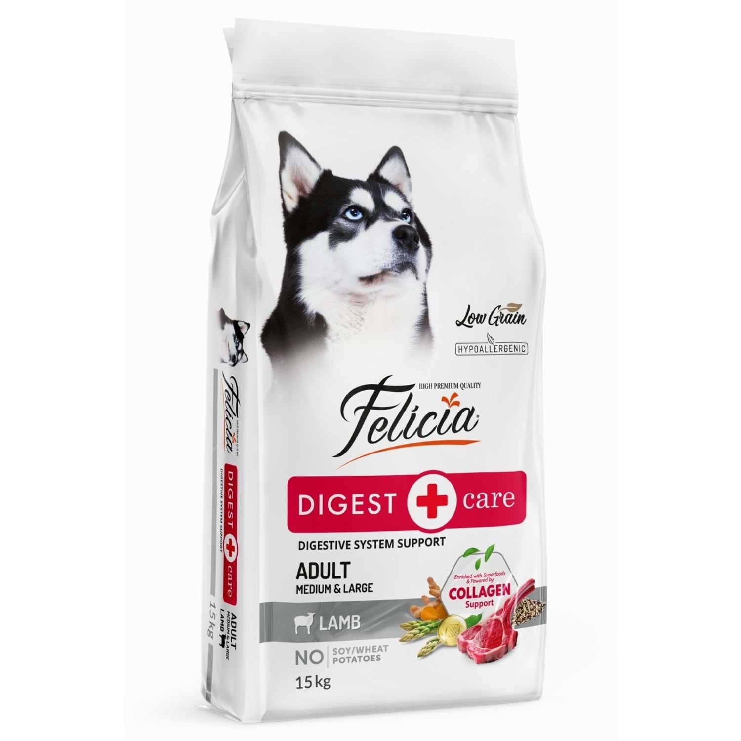 Felicia Köpek Maması Kuzu Etli Az Tahıllı 15 Kg, sevimli dostlarımızın doğal yaşam şartlarına uygun şekilde beslenip, daha sağlıklı yaşayabilmeleri için beslenme uzmanlarımız tarafından tahıl oranı düşürülmüş ve hypoallergenic özel bir formül olarak hazırlanmıştır. Yüksek oranda sindirilebilir hayvansal protein kaynaklarına sahip olan Felicia, sindirim ve alerji hassasiyetlerine karşı özel olarak geliştirilmiştir.